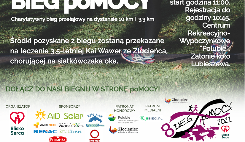Biegniemy dnia 18.07.2021 r. dla Kai Wawer z pobliskiego Złocieńca, która zachorowała na siatkówczaka oka. W połowie grudnia 2020 r. po operacji polegającej na usunięciu prawej gałki ocznej dziewczynka otrzymała pierwszą kurację chemioterapii JOE. Zebrane wcześniej fundusze zostały przeznaczone na leczenie i rehabilitację dla Kai oraz na dojazdy do Kliniki Onkologii w Warszawie.